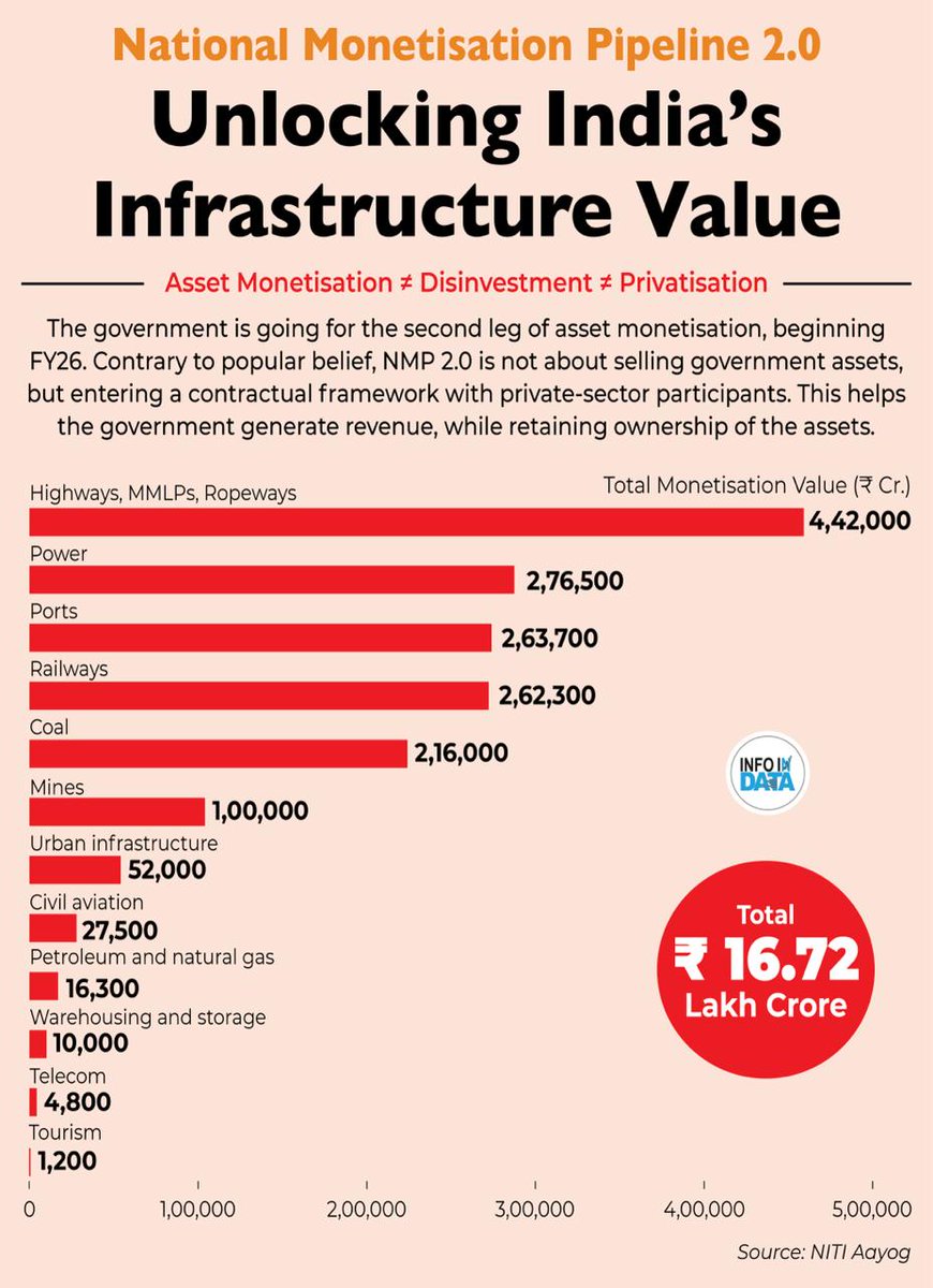 - Under NMP 2.0, the government aims to generate ₹16.72 lakh crore between FY 2026 and FY 2030 by unlocking value from over 2,000 assets across 12 sectors including highways, railways, power, ports, coal and mines. This figure also includes an estimated ₹5.8 lakh crore of private sector investment.